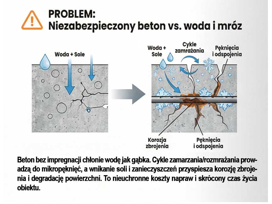 minimum 6 lat ochrony – jedna aplikacja impregnat do betonu zapewnia długotrwały efekt hydrofobowy i realne oszczędności na myciu oraz naprawach.