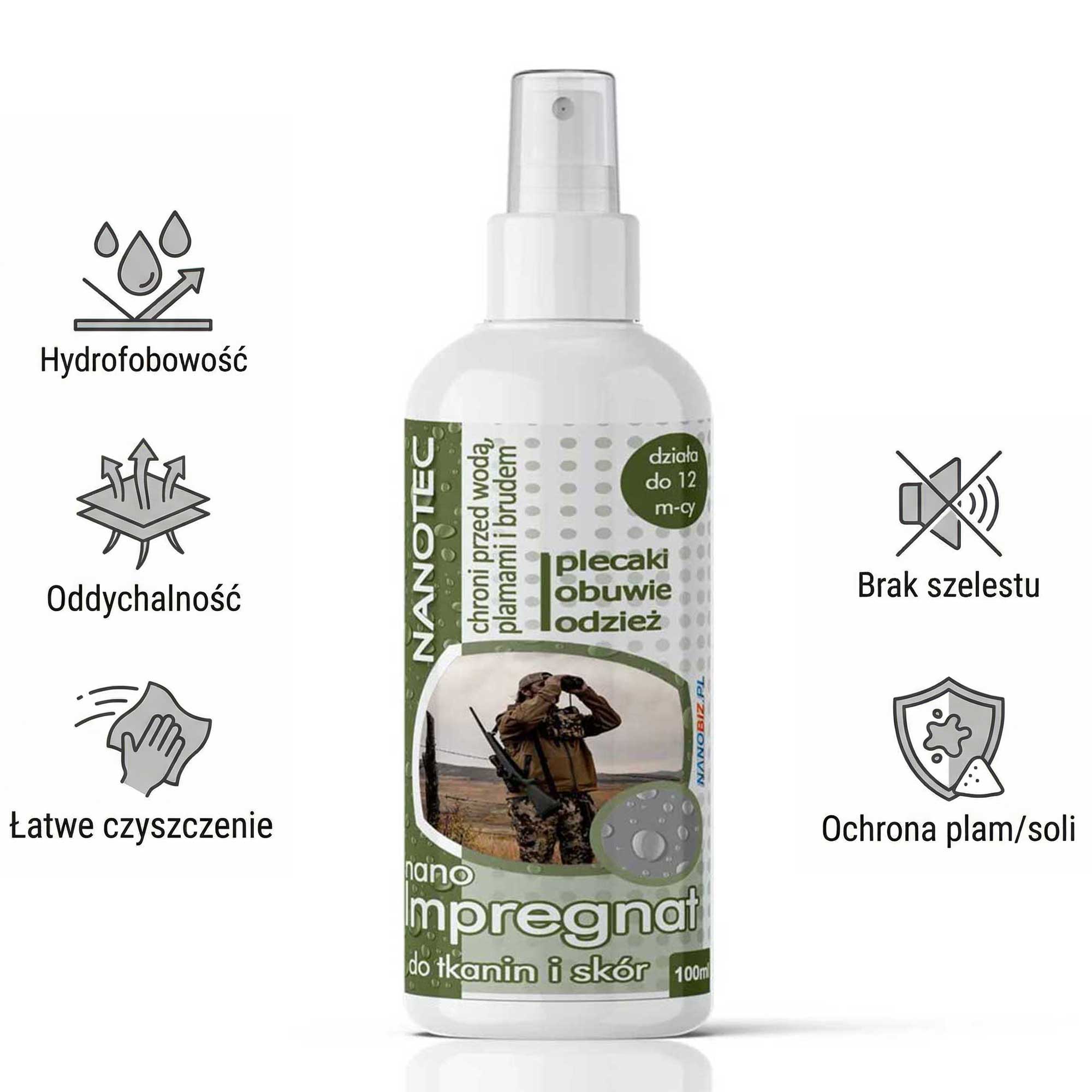 W zakresie obuwia i akcesoriów terenowych NanoTec Impregnat do odzieży i obuwia myśliwskiego nadaje się do materiałów wrażliwych i wymagających, takich jak zamsz i nubuk (zawsze po wykonaniu próby na małym, niewidocznym fragmencie), a także do skóry naturalnej nielakierowanej. Dzięki temu możesz zabezpieczać nie tylko kurtki i spodnie, ale również buty terenowe, rękawice, czapki, plecaki, torby, pokrowce i inne elementy wyposażenia tekstylnego, które w praktyce terenowej są szczególnie narażone na wilgoć, błoto, sól i trudne do usunięcia zabrudzenia.