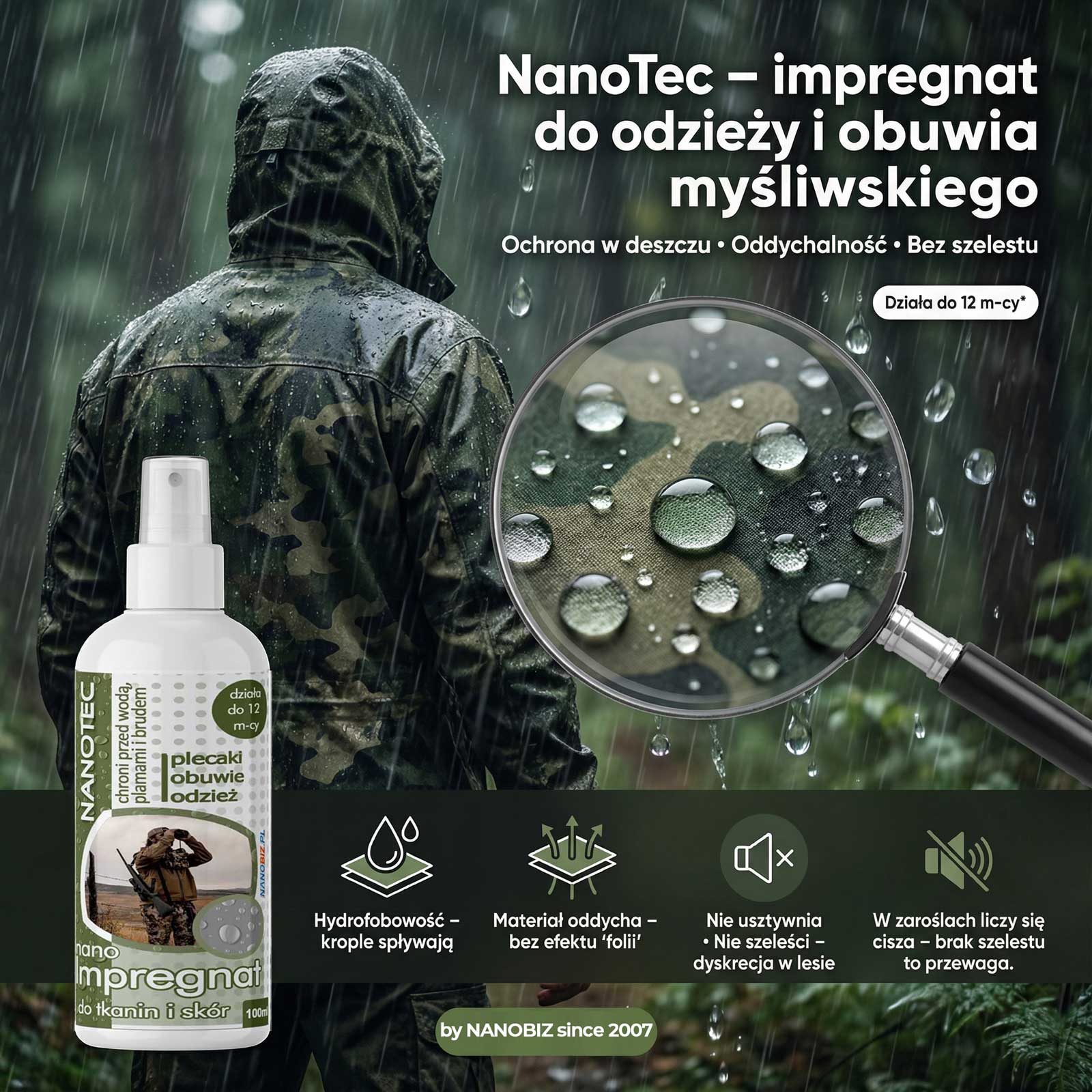 | Na jakie warunki pogodowe działa NanoTec Impregnat do odzieży i obuwia myśliwskiego? | NanoTec Impregnat do odzieży i obuwia myśliwskiego sprawdza się w deszczu, mgle, śniegu oraz przy kontakcie z mokrą trawą i roślinnością. Ogranicza nasiąkanie i pomaga utrzymać odzież w lepszym stanie. |