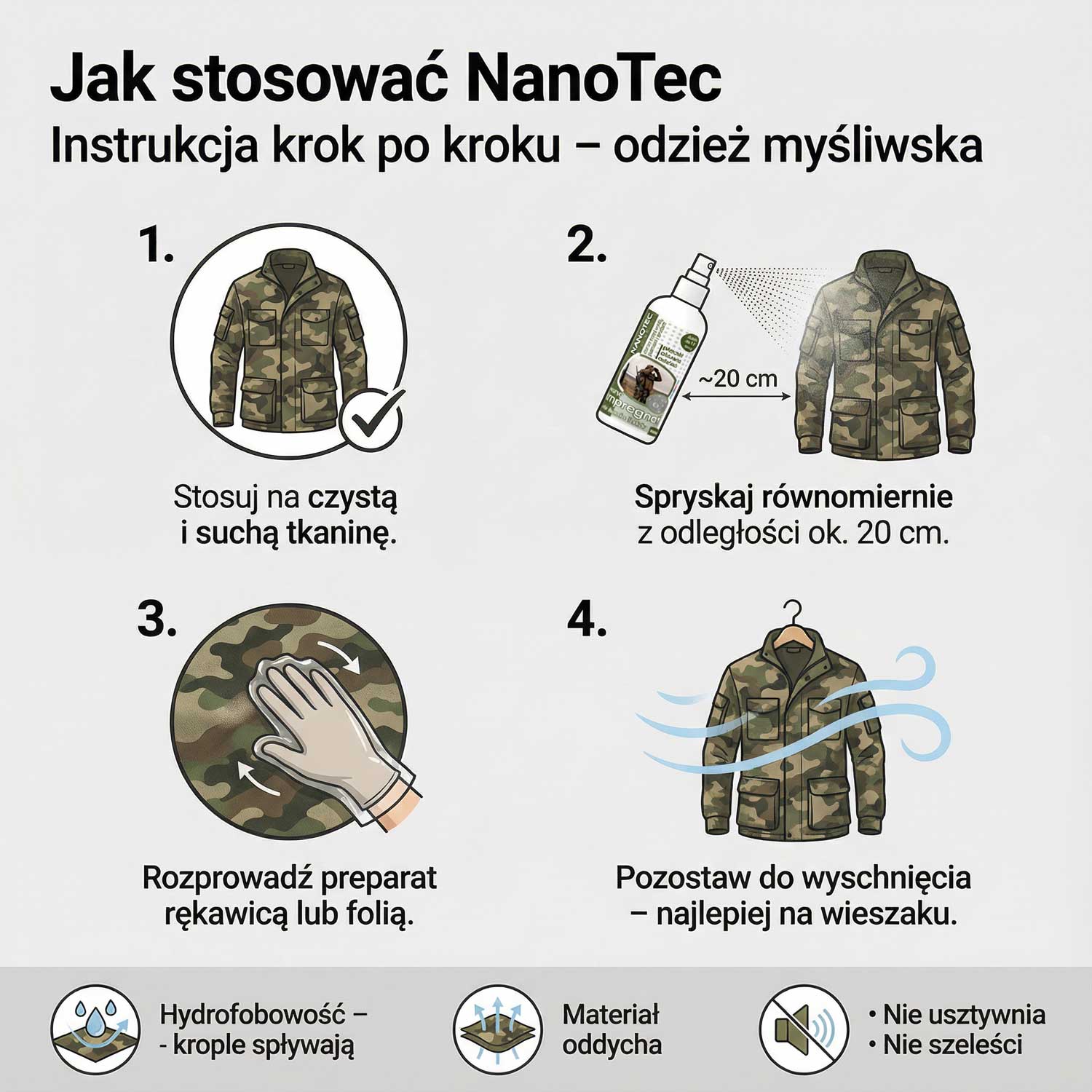 | Jak prawidłowo użyć NanoTec Impregnat do odzieży i obuwia myśliwskiego? | 1) Zrób próbę na małym fragmencie. 2) Materiał musi być czysty i suchy. 3) Spryskaj równomiernie. 4) Rozetrzyj ściereczką lub gąbką. 5) Pozostaw do pełnego wyschnięcia. Tak użyty NanoTec Impregnat do odzieży i obuwia myśliwskiego zapewnia równą i trwałą ochronę. |