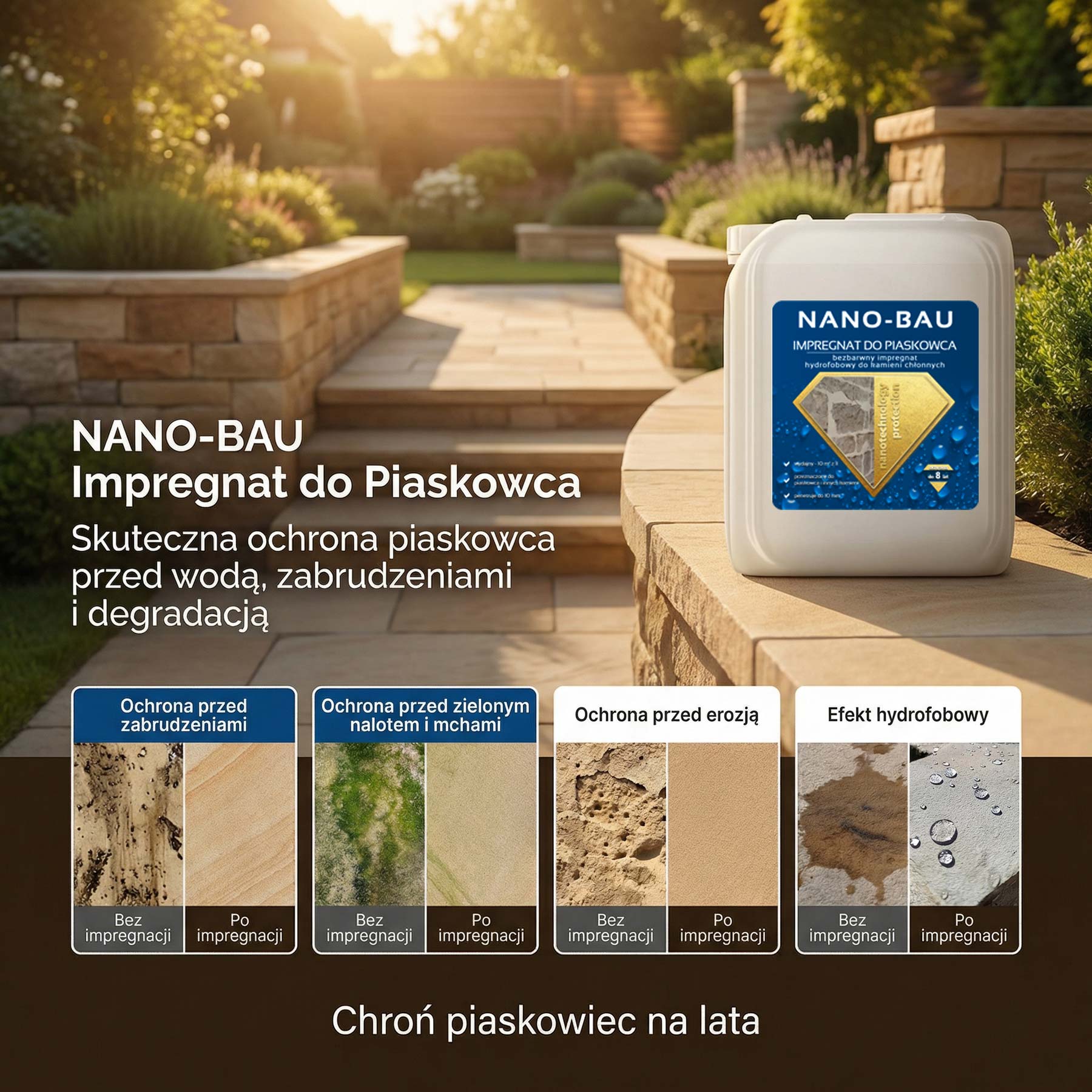 | 2. Na jak długo chroni kamień? | NANO-BAU impregnat hydrofobowy do piaskowca zapewnia trwałą ochronę nawet do 8 lat; w miejscach mocno narażonych na warunki atmosferyczne zwykle odświeża się go co 5 lat. |