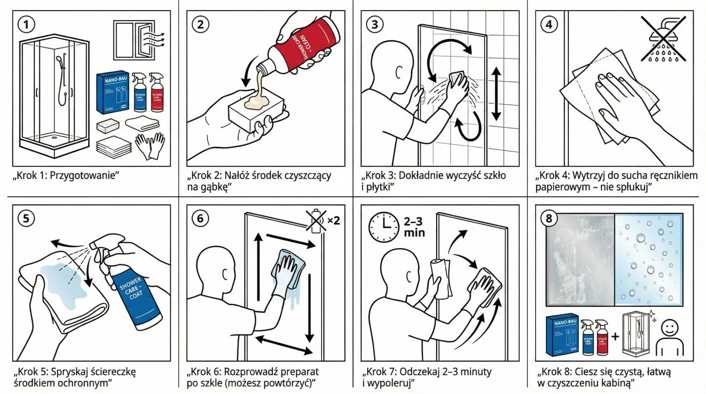 Czy po zabezpieczeniu nadal trzeba czyścić kabinę? Tak, ale zwykle rzadziej i szybciej. Powłoka ogranicza przywieranie zabrudzeń, więc często wystarczy woda i ściereczka lub delikatny środek.