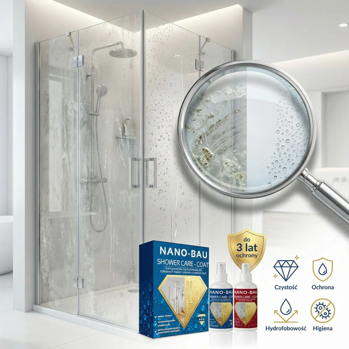 to kompleksowy zestaw do trwałego na lata zabezpieczania i impregnacji szklanych elementów kabin prysznicowych, ceramiki szkliwionej jak płytki, umywalki, toalety, brodziki itp. Zastosowane w preparacie nanocząsteczki krzemu łączą się chemicznie ze powierzchnią szkła lub glazurą ceramiczną silnie je hydrofobizując co nadaje im właściwości odpychające brud, mydliny, osady kamienia i wodę. Impregnacja hydrofobowa powoduje, że woda transportująca osady wapnia i inne zanieczyszczenia nie zasycha na zabezpieczonej powierzchni lecz pod wpływem siły grawitacji spływa z niej razem z brudem. Dodatkwo impregnacja powoduje uszlachetnienie powierzchni dzięki czemu zanieczyszczenia i osady, które mimo to zostały na  powierzchni można usunąć bez środków chemicznych samą wodą i ściereczką.