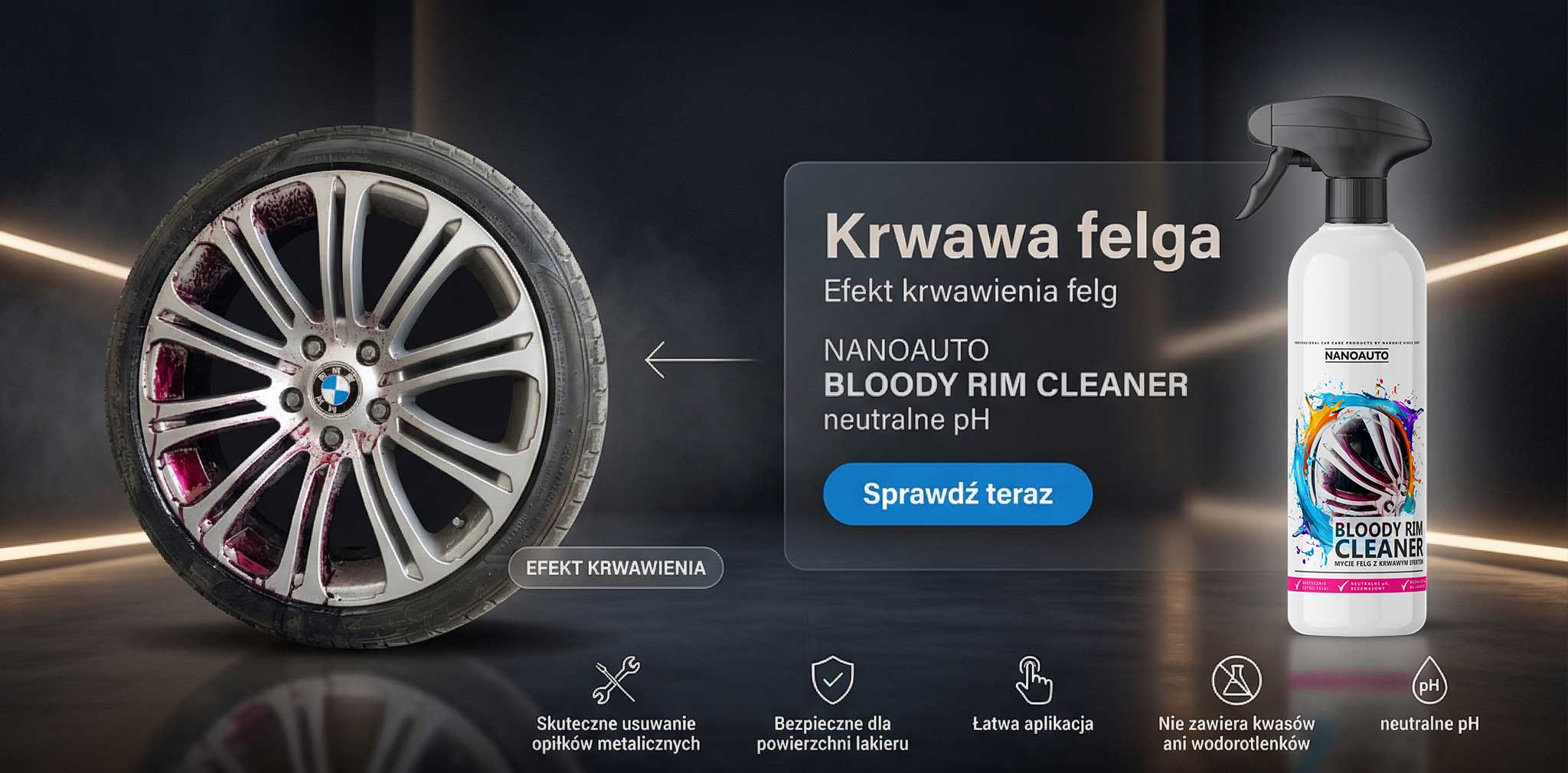 | 7. Różnice: felga stalowa vs aluminiowa – kiedy wystarczy chemia, a kiedy szlifowanie i malowanie? | Chemia (w tym NANOAUTO Bloody Rim Cleaner) działa świetnie na brud metaliczny i hamulcowy na obu typach felg. Stal szybciej wchodzi w korozję strukturalną — gdy masz łuszczącą się rdzę, pęcherze lakieru, ubytki: wchodzi renowacja. Aluminium częściej ma problem z osadem i utlenieniem — tu deironizacja + dokładne mycie zwykle załatwia 80% tematu. |