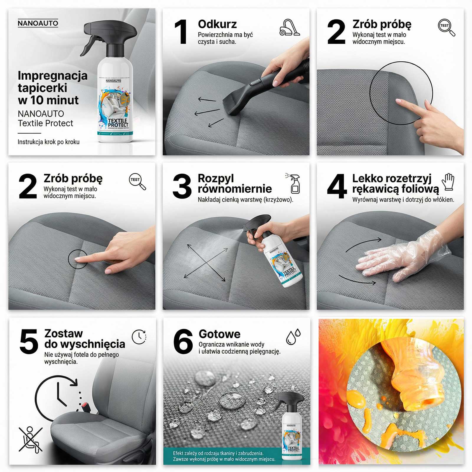 | 9) Czy muszę prać fotele ekstrakcyjnie przed nałożeniem, czy wystarczy odkurzyć? | Minimum to dokładne odkurzenie i usunięcie plam. Najlepszy efekt daje pranie, jeśli tapicerka jest realnie brudna — impregnacja na zabrudzeniach może je „utrwalić” optycznie lub utrudnić późniejsze doczyszczanie. NANOAUTO TEXTILE PROTECT Impregnat do tapicerki samochodowej aplikuj na czystą i suchą powierzchnię. |