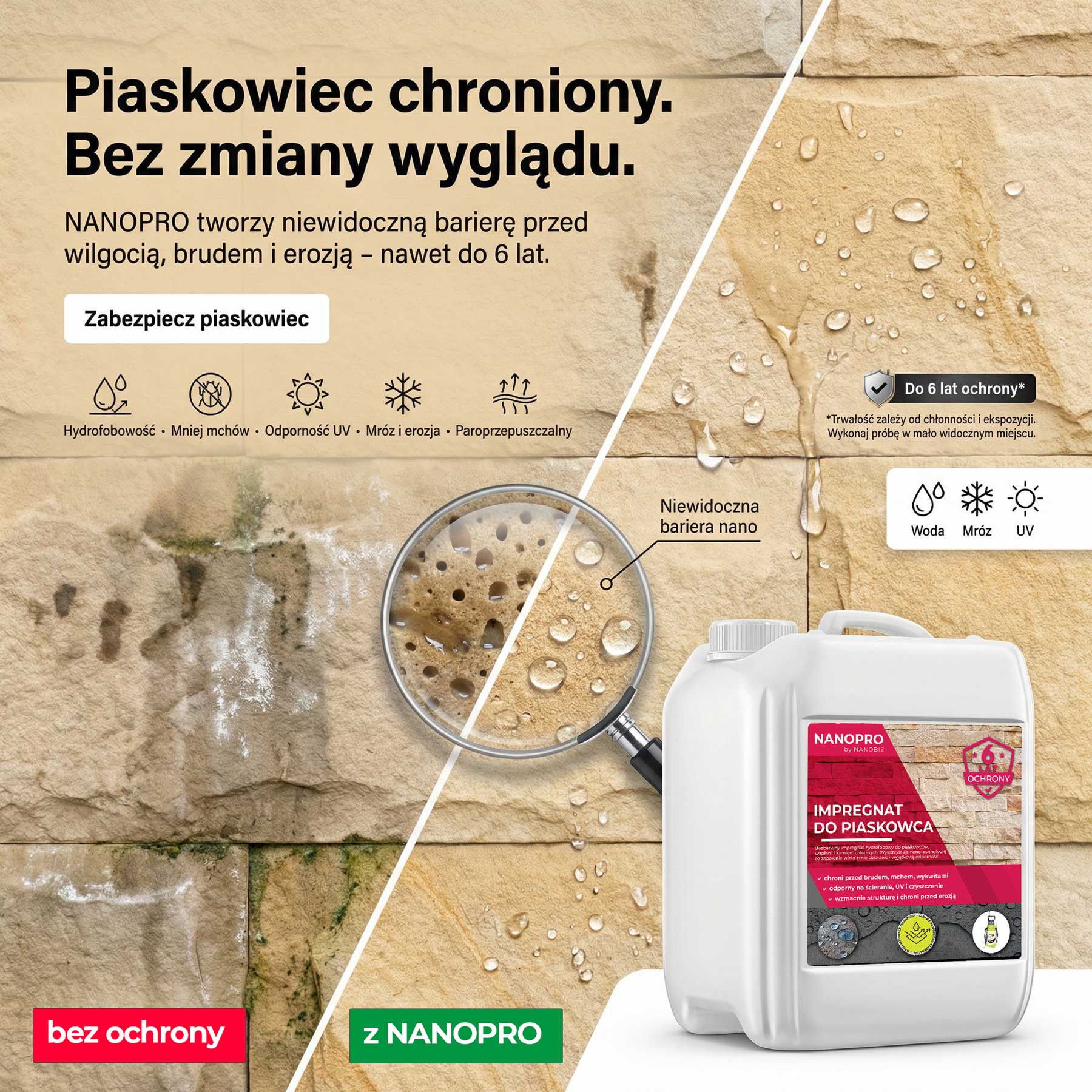 Woda, mróz, promieniowanie UV oraz zmiany temperatury – wszystkie te czynniki powodują erozję piaskowca i jego stopniowe niszczenie. NANOPRO Impregnat do piaskowca chroni kamień przed kruszeniem, łuszczeniem i pękaniem, przedłużając jego trwałość nawet do 6 lat.