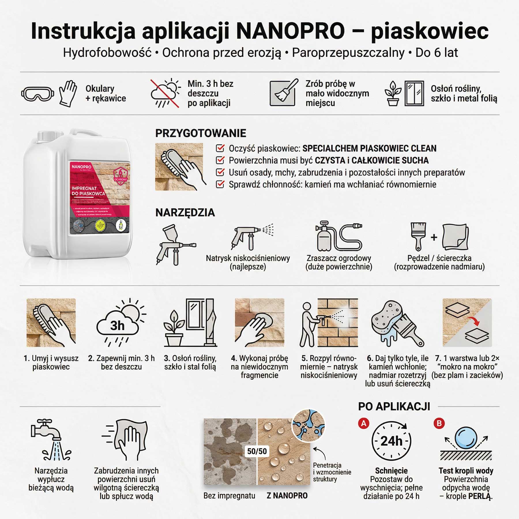 Zabezpiecz kamień z NANOPRO środkiem do impregnacji piaskowca i ciesz się naturalnym blaskiem przez lata. Dzięki zaawansowanej nanotechnologii preparat głęboko penetruje pory, zapewniając trwałą hydrofobizację piaskowca. Skuteczna bariera chroni przed wodą, mrozem, UV i porostami, gwarantując kompleksową ochronę piaskowca do 6 lat. Wybierz impregnację piaskowca bez zmiany koloru i utrzymaj powierzchnie czyste przy minimalnym wysiłku.