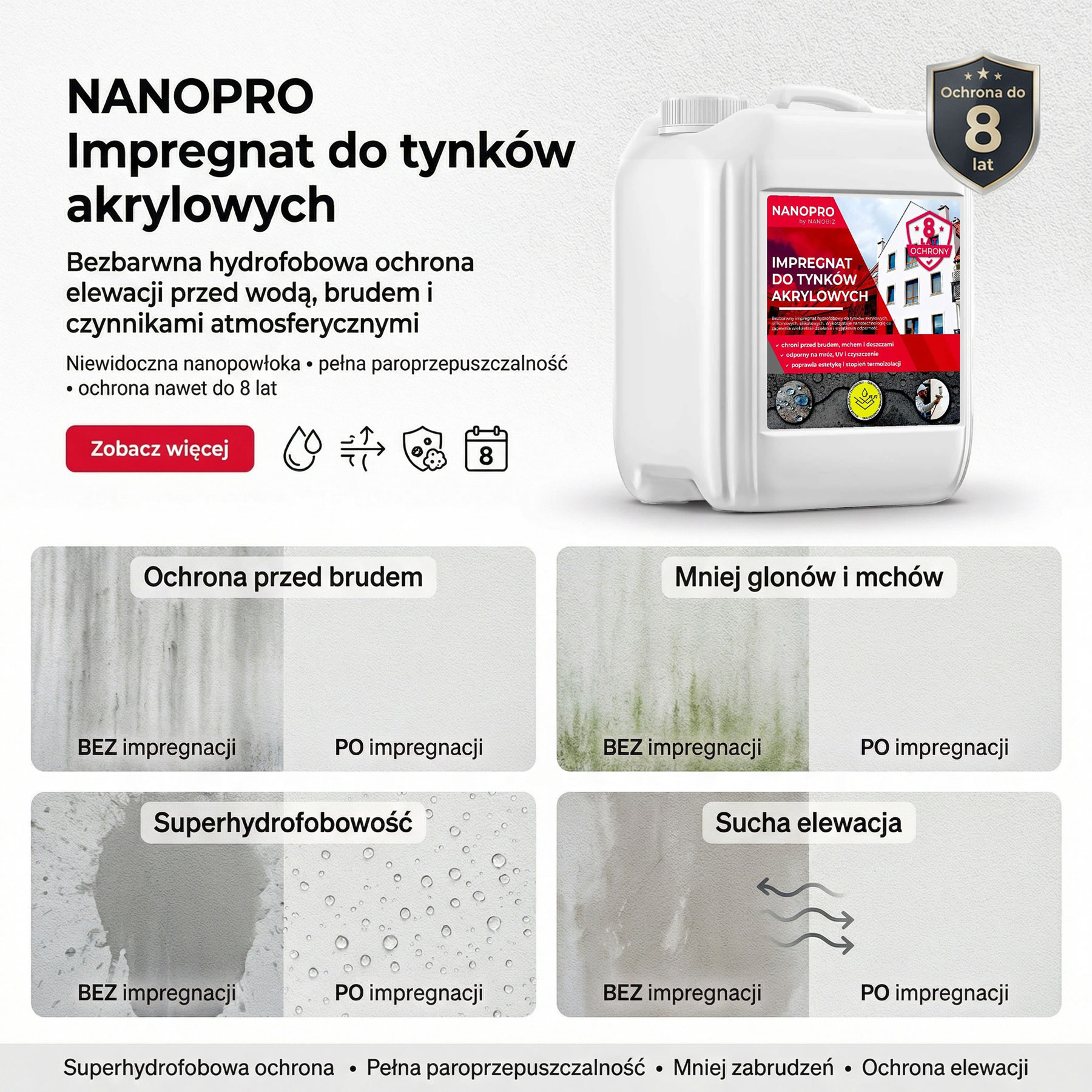 NANOPRO Impregnat do tynków akrylowych to niezwykle wydajny preparat hydrofobowy na bazie nanotechnologii, zapewniający kompleksową ochronę fasad przed wodą, zabrudzeniami oraz porastaniem przez mikroorganizmy przy zachowaniu pełnej paroprzepuszczalności tynków. Produkt charakteryzuje się wysoką wydajnością (40-60 ml/m²), łatwą aplikacją za pomocą zraszacza, pędzla lub wałka oraz wyjątkową trwałością sięgającą minimum 8 lat, co czyni go idealnym rozwiązaniem do długotrwałej ochrony wszelkich powierzchni tynkowanych.