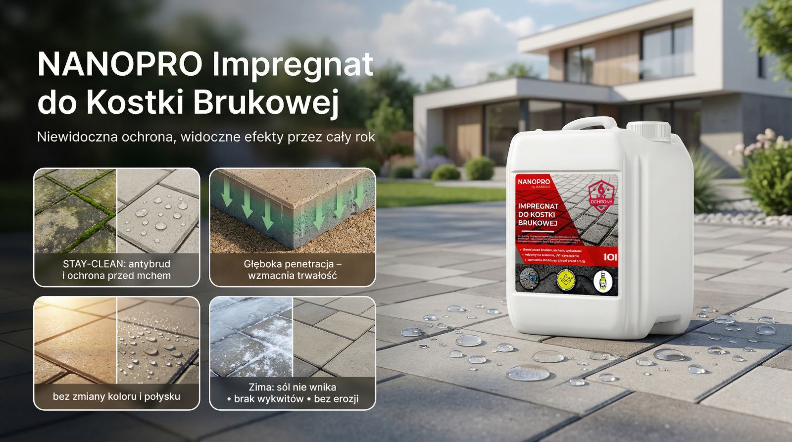 NANOPRO IMPREGNAT Nowoczesna Ochrona dla Kostki Brukowej znacząco ułatwia proces odśnieżania i odladzania w zimowych miesiącach, chroniąc jednocześnie powierzchnię przed erozją. Impregnacja zabezpiecza kostkę przed wykwitami solnymi, co jest istotne podczas stosowania soli do odladzania. Dzięki hydrofobowym właściwościom, powierzchnie po opadach szybko schną, nie absorbując brudu. Co więcej, impregnację można bezpiecznie stosować na nowo położonych kostkach, co pozwala na zapewnienie dodatkowej ochrony od samego początku.