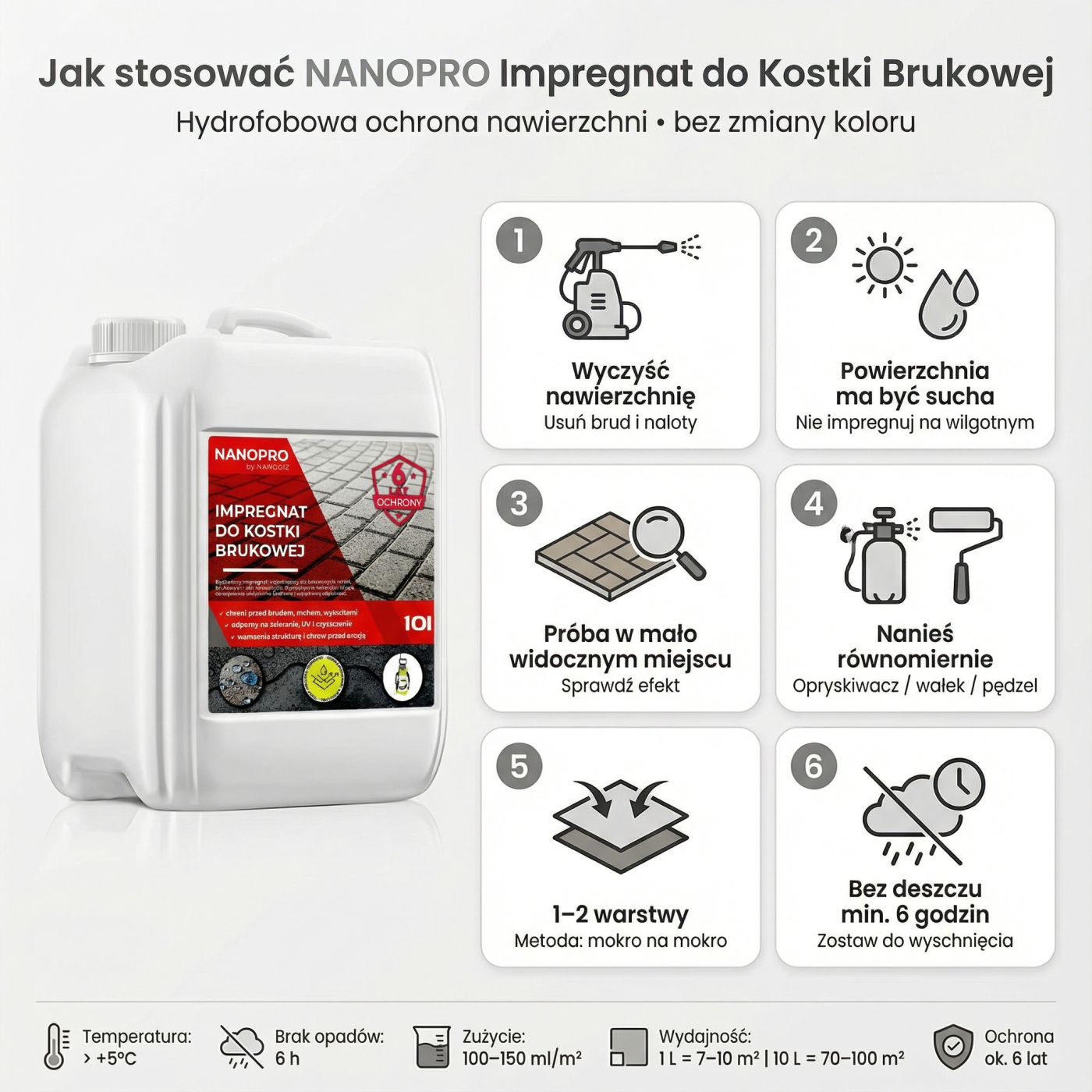 | 8. Ile produktu potrzebuję? | 1 l: 7–10 m², 5 l: 35–50 m², 10 l: 70–100 m² (w zależności od chłonności podłoża). |