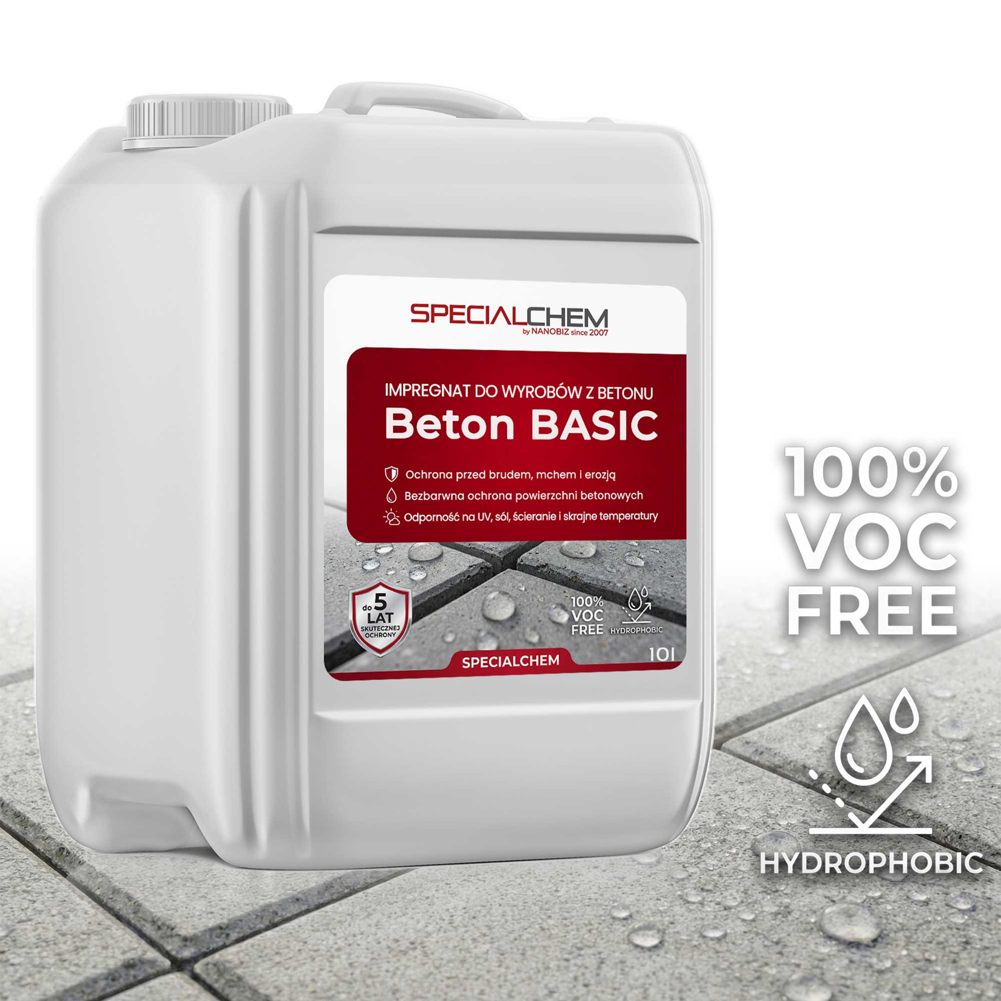 SPECIALCHEM Beton Basic impregnacja betonu to specjalistyczny impregnat, który efektywnie wydłuża żywotność materiałów budowlanych z betonu. Stosując ten preparat, tworzysz na powierzchni warstwę, która zapobiega osadzaniu się brudu, co znacznie ułatwia czyszczenie oraz eliminuje ryzyko nieusuwalnych plam. W przypadku zabrudzenia wystarczy spłukać beton wodą — brud nie ma szans na przywieranie.
