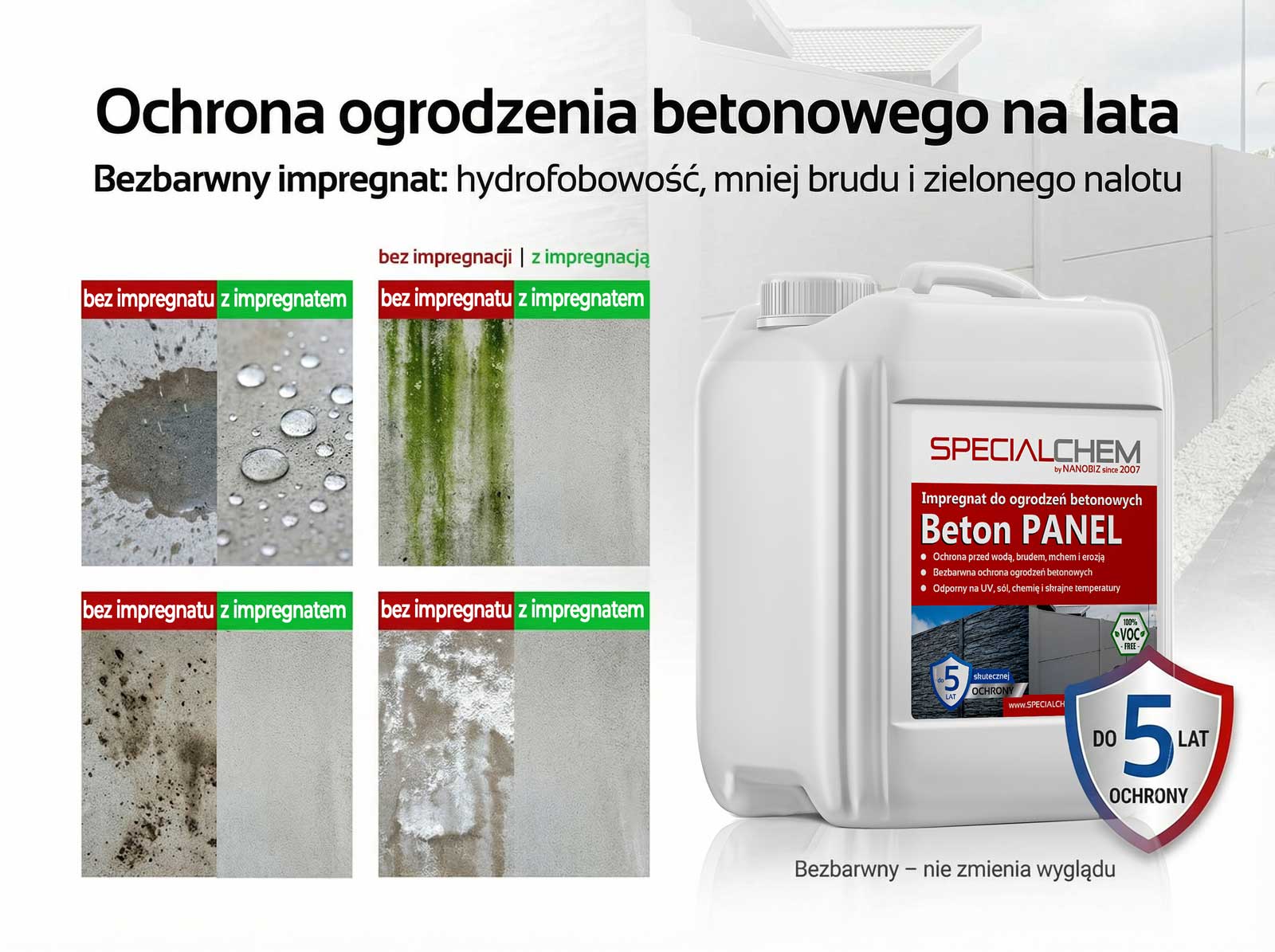 Specialchem BETON PANEL do impregnacji ogrodzeń to innowacyjny produkt do impregnacji ogrodzeń, opracowany w technologii nanotechnologicznej, doskonały do bezbarwnej ochrony ogrodzeń panelowych, palisad oraz innych elementów betonowych. Preparat skutecznie impregnuje i hydrofobizuje powierzchnie, co uniemożliwia przenikanie wody i zanieczyszczeń do wnętrza materiału.