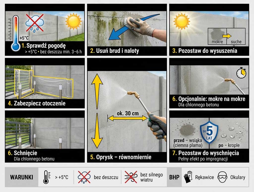 8. W jakich warunkach można pracować? Temperatura powietrza i betonu powinna wynosić ≥ +5 °C. Nie impregnuj w pełnym słońcu ani tuż przed deszczem; zaplanuj co najmniej 3 h bez opadów po zakończeniu pracy.