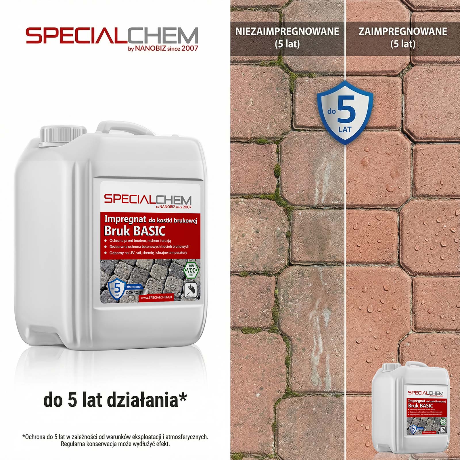 SPECIALCHEM Bruk Basic Impregnat do kostki brukowej to innowacyjny produkt stworzony specjalnie do zabezpieczania powierzchni kostki betonowej oraz płyt betonowych. Jego zaawansowana formuła, oparta na nanotechnologii oraz cząsteczkach silanów, zapewnia skuteczną ochronę przed zabrudzeniami oraz ogranicza wchłanianie wilgoci, co jest kluczowe dla zachowania estetyki oraz trwałości nawierzchni.