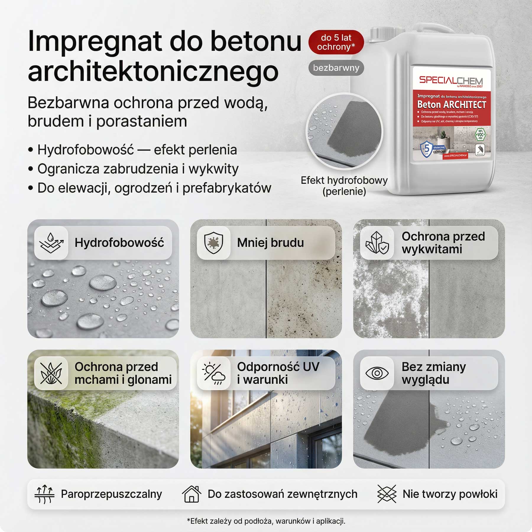SPECIALCHEM Beton ARCHITECT to innowacyjny, nanotechnologiczny produkt do bezbarwnej ochrony powierzchni wykonanych z betonu gładkiego o wysokiej gęstości. Preparat skutecznie impregnuje oraz silnie hydrofobizuje powierzchnie wyższych klas betonu tj. C25, C30, C35. Dzięki zastosowaniu impregnatu woda i inne zanieczyszczenia nie wnikają do wnętrza powierzchni betonowych.