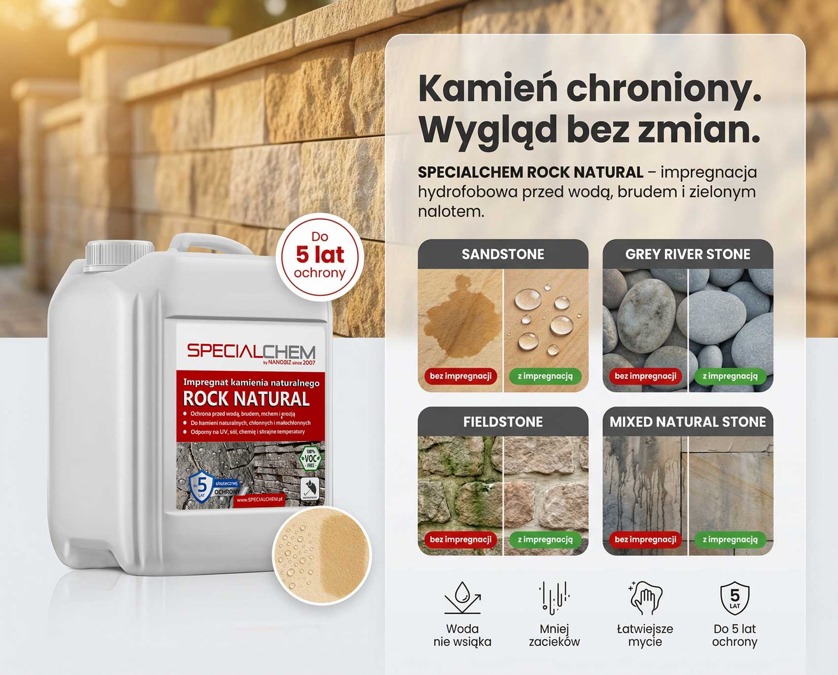 Specialchem ROCK NATURAL impregnat do kamienia naturalnego to wodny impregnat nanotechnologiczny przeznaczony do trwałej ochrony kamienia na zewnątrz i wewnątrz budynków. Preparat zabezpiecza powierzchnię przed wnikaniem wody, soli i zabrudzeń oraz ogranicza erozję i degradację pod wpływem warunków atmosferycznych. Dzięki głębokiej penetracji w strukturę podłoża ochrona jest odporna na użytkowanie nawet na posadzkach i w strefach intensywnego ruchu. Formuła roztworu wodnego nie pozostawia nieprzyjemnego zapachu i nie zawiera toksycznych rozpuszczalników. Impregnacja działa w porach kamienia, a nie jako „film” na powierzchni, co ułatwia utrzymanie czystości i redukuje przywieranie zanieczyszczeń. Jeśli szukasz rozwiązania „na lata” do kamienia naturalnego, Specialchem ROCK NATURAL impregnat do kamienia naturalnego jest celowanym wyborem do zabezpieczenia powierzchni mineralnych.